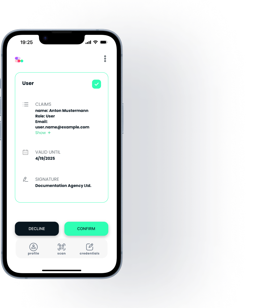 If you scan the QR Code with the sideos wallet you will see the screen below to accept the credential offer and store it on your phone. If you select the credential and click in CONFIRM the credential is stored on your phone.